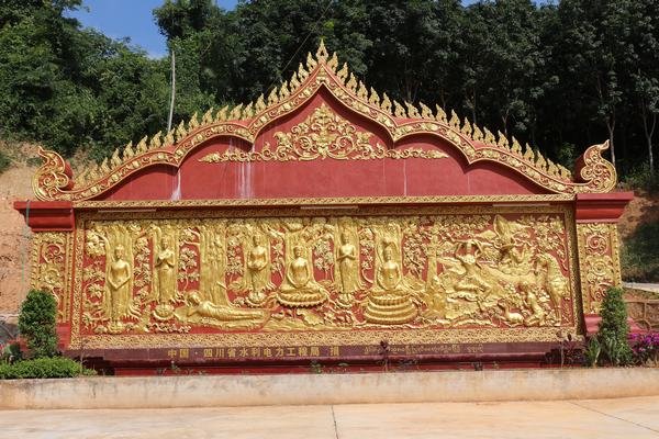 四川省水利電力工程局作為勐瓦電站的施工單位為這座釋迦牟尼大佛捐建了一座精美佛像照壁,表達對當?shù)孛袼鬃诮痰淖鹬睾蛯峦唠娬窘ㄔO友好合作的良好祝愿。