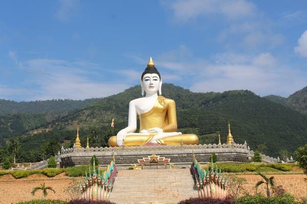曼哈釋迦牟尼大佛高21米,占地面積220平方米,背靠云霧繚繞的高山,大佛以慈祥的面容俯視著景康的山山水水、村村寨寨,保佑著電站的順利建成和各族人民的和平生活。
