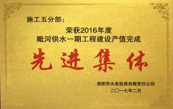 2017年2月17日,業(yè)主在資陽市委黨校組織業(yè)主管理部門、設(shè)計、監(jiān)理、施工、移民等單位召開2016年度毗河供水一期工程建設(shè)管理工作會,局毗河工程項目部在評比中獲得2016年度毗河一期工程建設(shè)產(chǎn)值第一名(先進集體),四處副處長兼項目部常務(wù)副經(jīng)理羅茂林、總工程師張亮亮獲得2016年度生產(chǎn)先進個人榮譽稱號,為工程局贏得了榮譽。