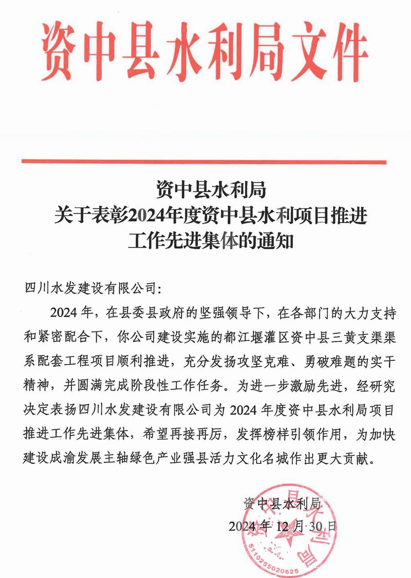 近日,二分公司承建的都江堰灌區資中縣三黃支渠渠系配套工程項目榮獲資中縣水利局“2024年度資中縣水利局項目推進工作先進集體”稱號,充分肯定了三黃支渠項目在2024年的辛勤付出。