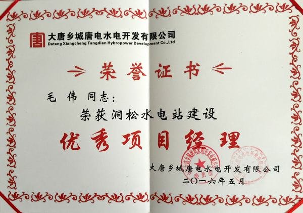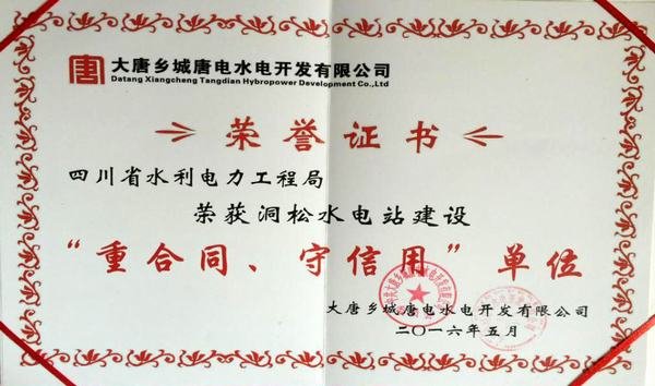 2016年5月10日16時(shí),大唐鄉(xiāng)城唐電水電開發(fā)有限公司在鄉(xiāng)城縣召開了簡潔而隆重的“碩淉電站投產(chǎn)發(fā)電先進(jìn)表彰大會(huì)”,四川省水利電力工程局榮獲洞松水電站建設(shè)“重合同、守信用”單位榮譽(yù)稱號(hào),項(xiàng)目經(jīng)理毛偉榮獲洞松水電站建設(shè)“優(yōu)秀項(xiàng)目經(jīng)理”榮譽(yù)稱號(hào)。