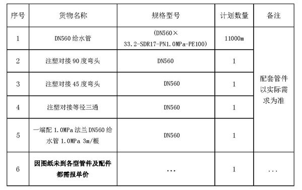 1.2采購(gòu)范圍:DN560 PN1.0MPa PE管材及管件,PE管總用量約11000米。