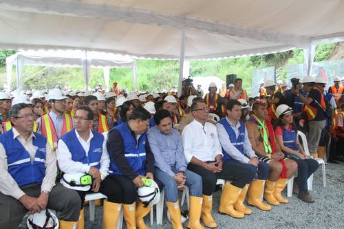 14時10分,在厄瓜多爾TP水電站pilaton取水口舉辦的截流儀式正式開始,厄瓜多爾副總統、戰略部長、電力部長、業主總經理、建設、設計、監理、施工負責人,以及厄瓜多爾媒體、學生團隊等近300人參加了截流儀式。